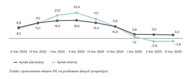 Na rynku wtórnym z kolei ceny spadły o 2,6 proc. względem analogicznego okres w 2024 r. (jest to kolejny kwartał ze spadkiem, -2,8 proc. r/r w II kw. 2025 r.).